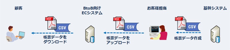 | 基幹システムとの連携 | ECシステムで入力された注文データを基幹システムに連携することで 従来行っていた基幹システムへの入力業務を大きく軽減することができます。 |