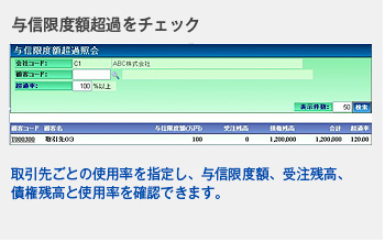 - 与信限度額、受注残高、債権残高、超過率を確認することが可能です。