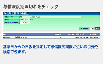 - 与信限度期限切れチェックが可能です。限度枠設定実施者の制限や監査ログを取得できます。