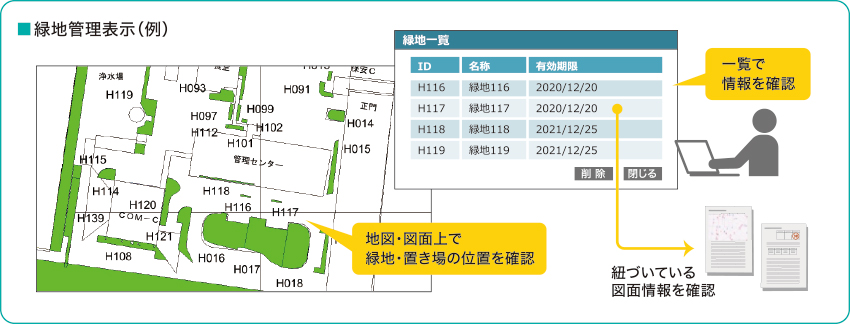 これらの緑地や資材置き場を管理しているのが、生産技術部の設備計画室です。工事などにより一時的に緑地を移動させたり、協力会社へ資材置き場として貸し出す際には、各部署から申請を受け付け、台帳を更新するという形で運用していましたが、どちらの地区でも現状把握や管理を効率的に行うことができていませんでした。