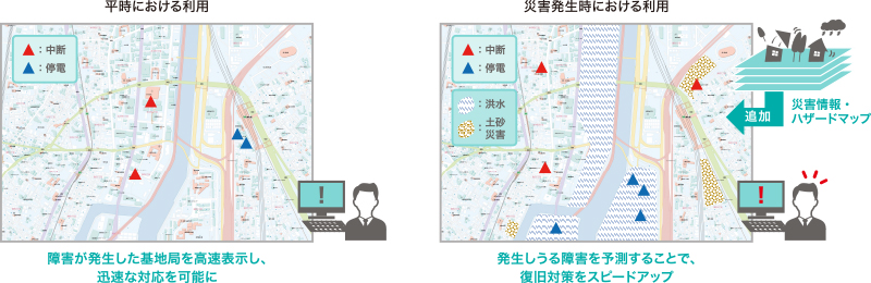 NTTドコモは、社内データに続き外部データを追加するための機能拡張にとりかかっています。防災情報や気象データを重ね合わせて表示できれば、障害の背景や要因を保全部門がより正確に把握できるからです。