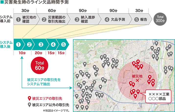 土地勘がない地域においては、取引先一覧だけではどこが震源地の近くか、被害を受ける可能性があるか、など瞬間的に把握するのは難しいものです。災害情報や拠点情報、調達先の関係性を地図上に可視化し、さらに受発注システムと連動することによって、素早い判断を下せるようになりました。こうした「納入部品危機管理システム」によって、従来の5分の1の時間で欠品予測までの調査を完了させることができたという地震災害における実例もあがっています。