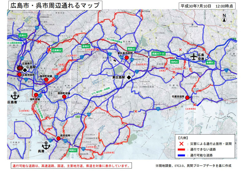 出典:国土交通省「災害時における通行可否の情報(通れるマップ)平成30年7月豪雨関係 7月10日12:00時点」