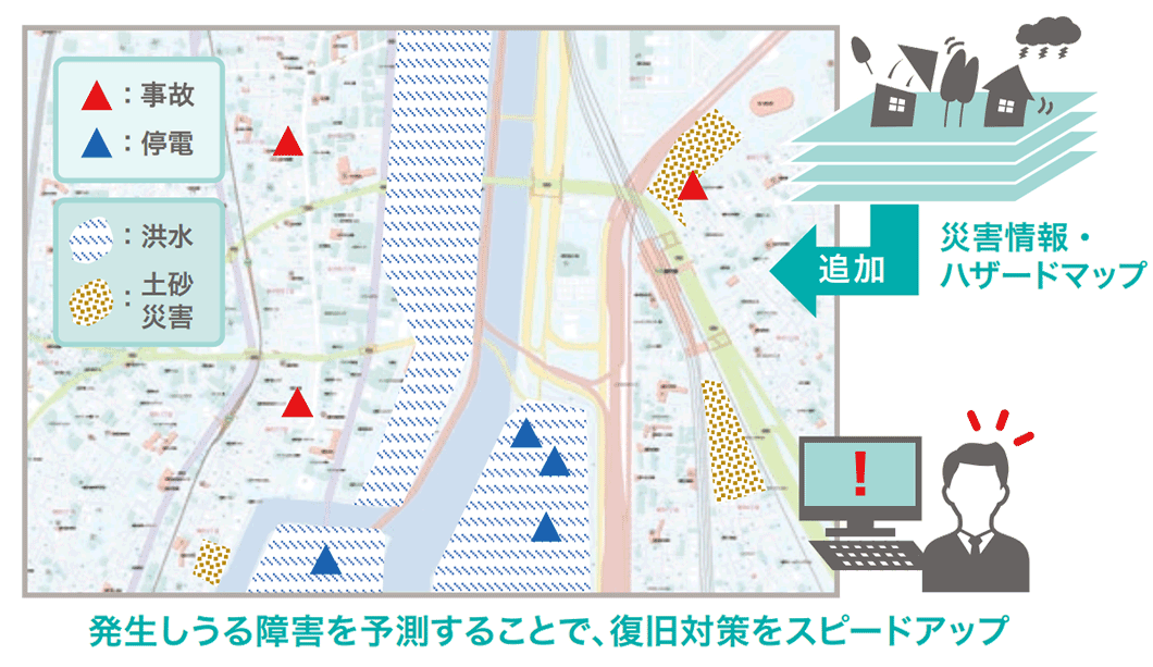 自社の情報と気象データを重ね合わせて表示、影響箇所を特定