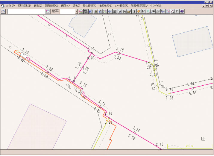 ゼンリン製電子地図「Zmap-TOWN Ⅱ」など、市販地図を採用することで地形図の初期入力コストを削減。システムのコストパフォーマンスを高めています。また、既存導管図面のスキャナ読み込みにも対応しています。
