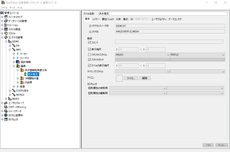 「GeoMation 地理情報システム サーバーソフトウェア」に「GeoMation 地理情報システム Web クライアント」、または「GeoMation 地理情報システム Web地図配信サーバーソフトウェア」を連携することで、Web型システムを構築することができます。加えてシステムに必要なユーザー管理、コンテンツ構成管理、アクセス制御、図形描画スタイル管理なども行ないます。これらのシステム情報は、地理情報システム サーバーに付属する「管理コンソール・ユーティリティ」によりビジュアルに編集でき、運用管理も容易です。