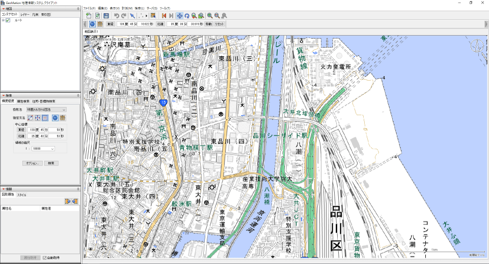 - 任意の位置または地図中の図形を選択して、座標・距離・面積・角度・周長を計測