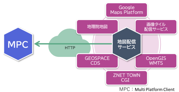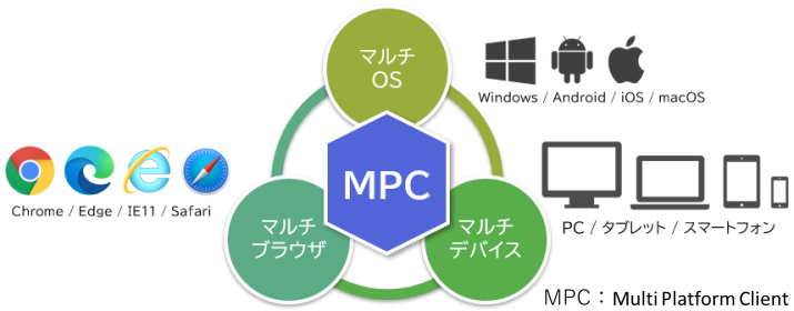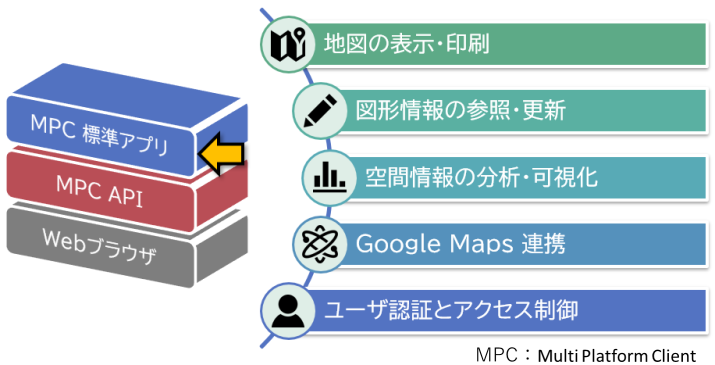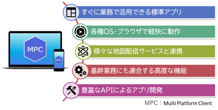「GeoMation地理情報システム マルチプラットフォームクライアント(以下、MPCと略す)」は、Windows/iOS/Android, Chrome/Edge/IE/Safariといった幅広いプラットフォーム上で動作するWeb GISプラットフォームです。異なるプラットフォーム上で同じアプリケーションを動作させることが可能となるため、社内業務と社外業務など、GISアプリケーションを活用する幅が広がります。