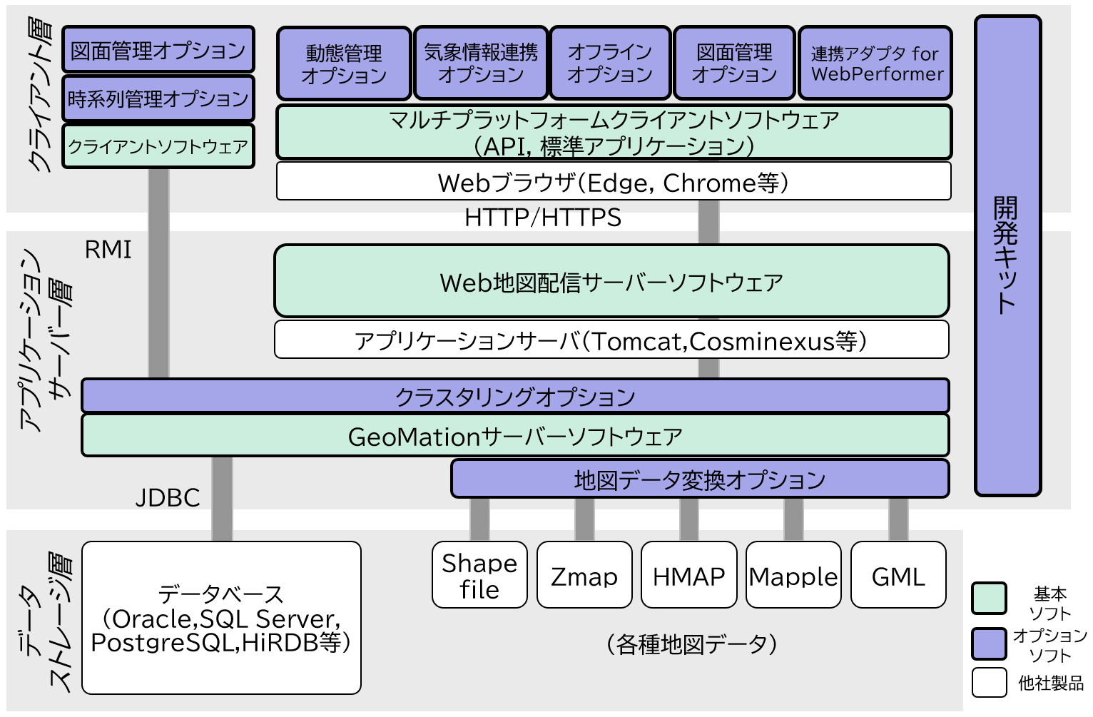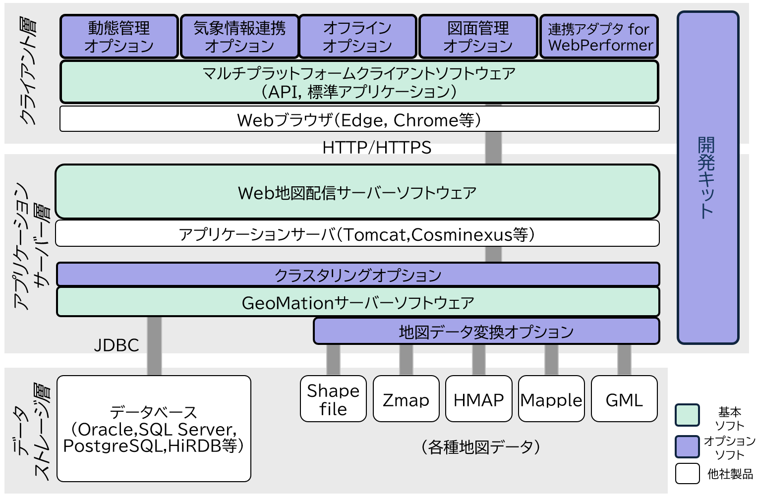 GeoMation 地理情報システムは、データストレージ層、アプリケーションサーバー層、クライアント層の3階層構造をベースに構成されており、スタンドアロンやC/S対応を実現する「デスクトップ構成」、Web型システムを実現する「Web構成」、「デスクトップ構成」と「Web構成」の混在...といった柔軟な構成を組むことができます。