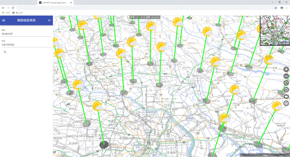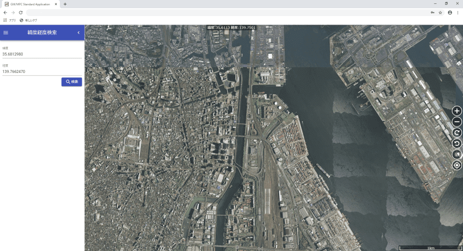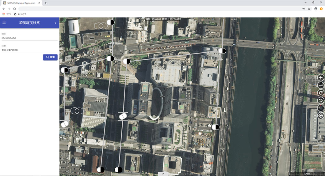 衛星画像とベクトル地図を重ね合わせて表示した画面例
