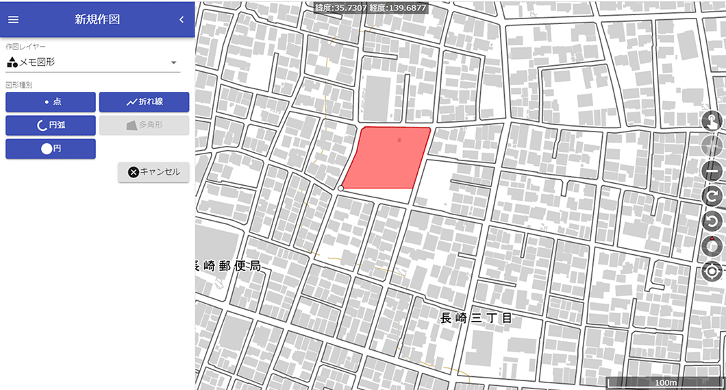 文字、線、多角形、円、円弧などの描画・作図のほか、フォント、線種、線幅、色などの地図図形属性の変更、移動、複写、消去、ストレッチなどの図形編集が可能です。