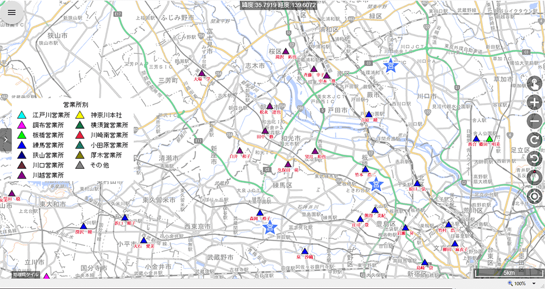 例えば、顧客情報に含まれる住所情報と住所データベースをマッチングさせることで、顧客情報を地図上に展開・可視化することができます。これにより、顧客分布を地図上で確認することができます。