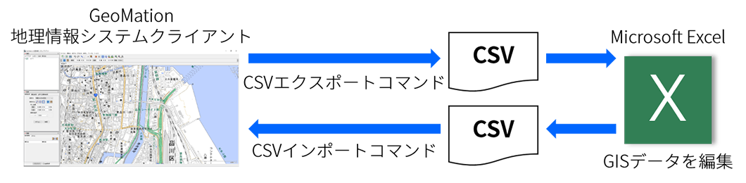 Excelで編集したデータをCSV形式ファイルに書き出し、GeoMation 地理情報システムにCSVインポートすることで、編集結果が反映されます。