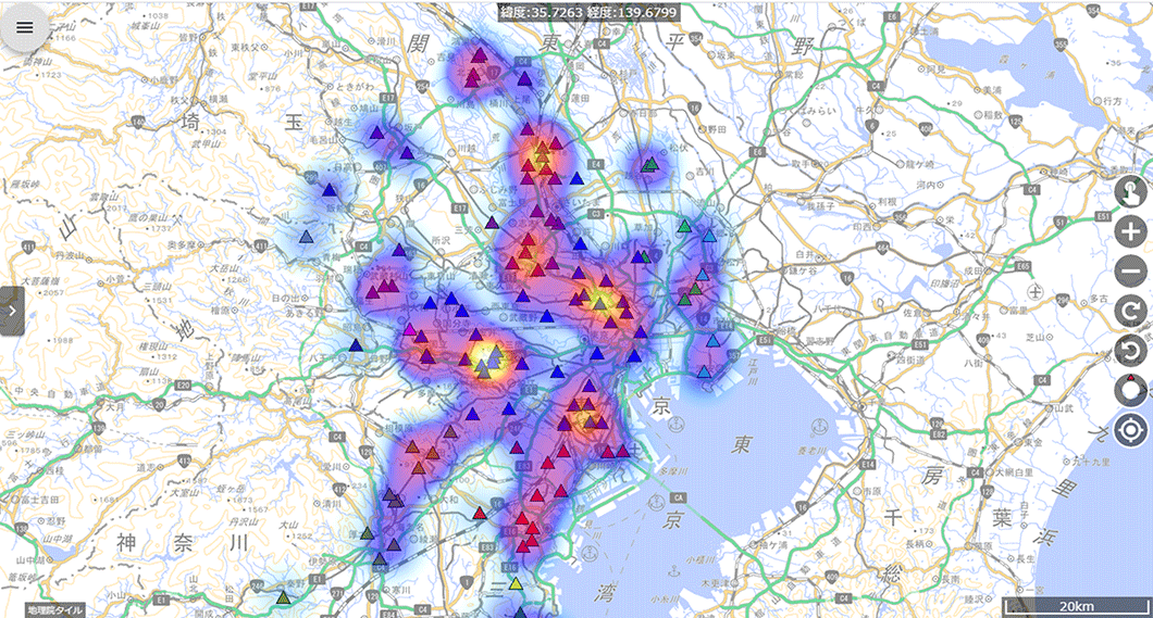 例えば、人流や交通流といった膨大なレコード数の位置情報を集約し、ヒートマップやグラフ、など値線などで地図上に表示することで、エリアマーケティングやシミュレーションなどに活用できます。