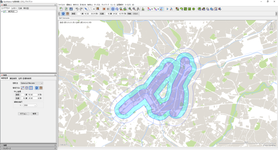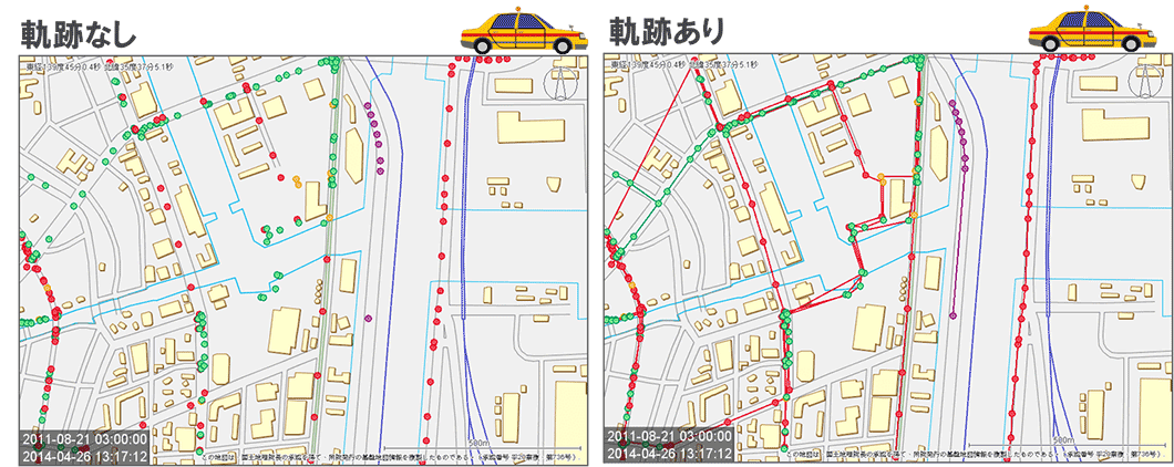 - アニメーション機能により、時間を自動変化させて、移動体や地物などの地図上形状の変化をアニメーションで見ることが可能です。