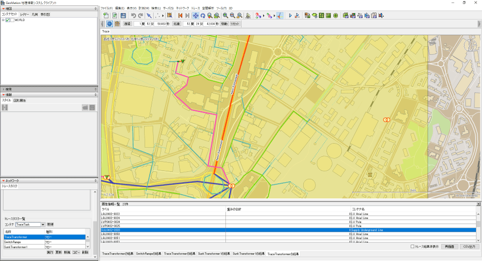 ネットワークデータ(ノード、エッジ)には、任意の属性項目を設定できます。この属性項目に応じたトレース制御も可能です。例えば、管網解析、断線検知などの機能を開発することができます。