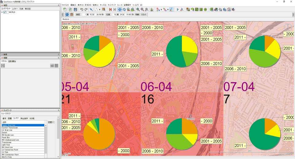 集計・演算結果に基づき、地図上の対象エリアの色分表示、グラフ(円・棒)表示、凡例表示ができます。