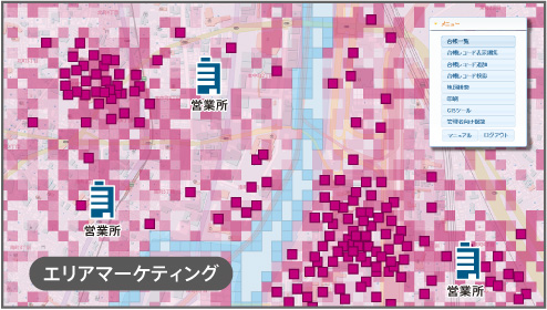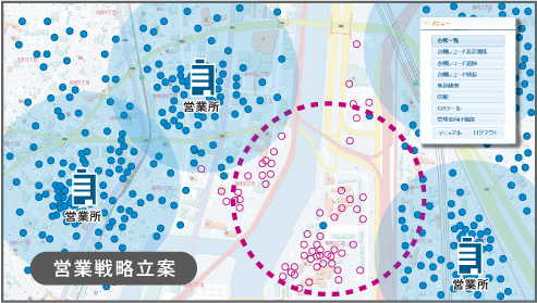 お客さまが管理する営業所情報と顧客情報を地図上に可視化することで、営業活動の効率化や出店計画などを支援します。