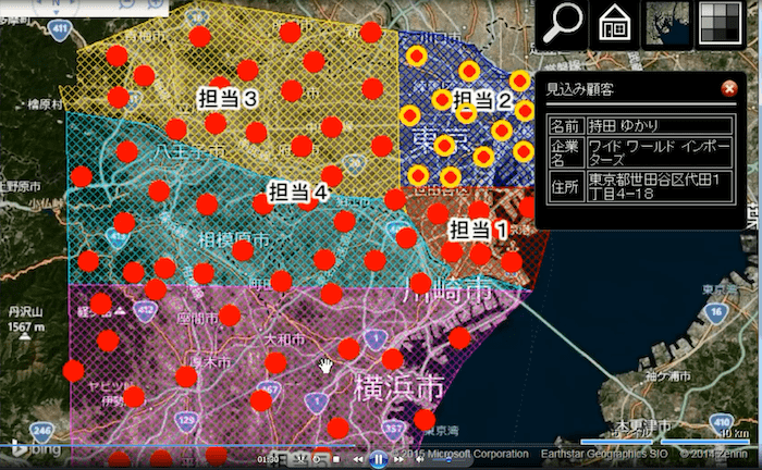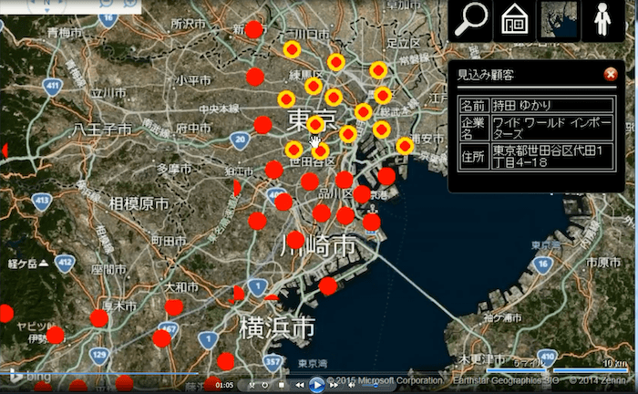 - Microsoft Dynamics® CRMで管理される顧客情報を地図上に展開することで、顧客分布の把握を支援。