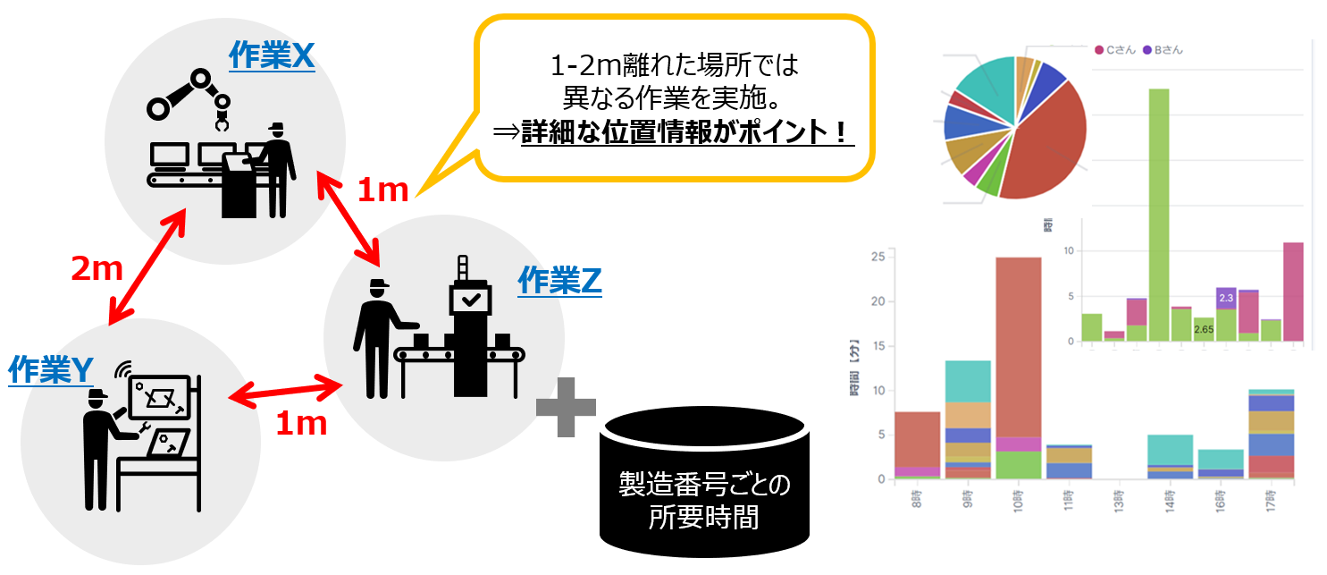 - 作業エリアと作業内容が紐づけられているが、エリアが近接しており精度の高い作業者の位置情報が必要。