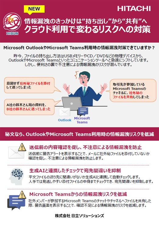 Microsoft OutlookやMicrosoft Teams利用時の情報漏洩リスクについて秘文による解決策をご紹介したリーフレットです。