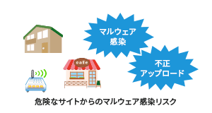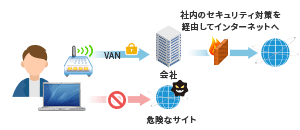 自宅やカフェの公衆無線LANなどから、直接インターネットに接続できてしまうと、クラウドストレージや危険なサイトにアクセスでき、業務情報を不正にアップロードしたり、マルウェアに感染し、情報漏洩してしまうリスクがあります。