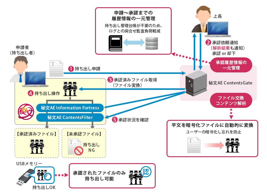 コンテンツ持ち出し時の申請・承認・監査業務(台帳記入・突合せなど)の運用が煩雑でしたが、秘文AE ContentsFilterおよび秘文AE ContentsGateで持ち出し履歴情報を一元管理することで、お客さまの運用コスト削減が可能になります。
