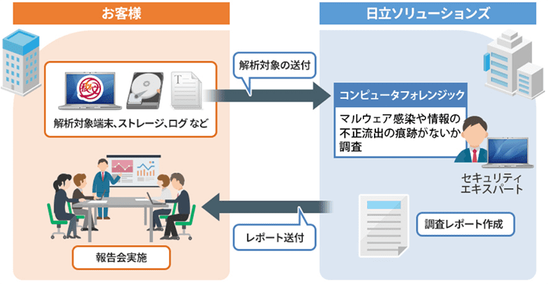 「インシデント発生時の詳細調査用ログ取得」機能を導入いただいているお客さまを対象に、本機能で取得、保管しているログを用いて侵害調査を行うことで、お客さまのインシデント対応をサポートするサービスを有償で提供しております。サービスメニューの内容は下記をご参照ください。