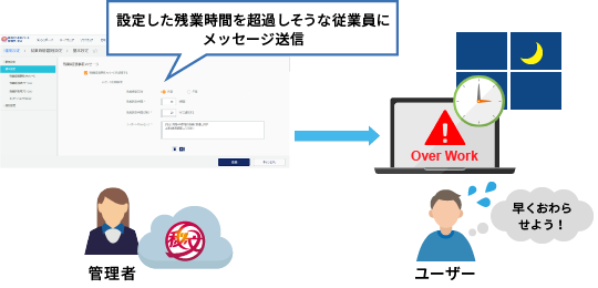 勤怠管理ダッシュボードから、月間・年間の残業時間が一定時間を超えている従業員の人数や、月間・年間を通して残業時間が多い従業員の氏名と時間を確認できます。設定した残業時間を超過する前に通知メッセージを送ったり、強制的にシャットダウンやログオフも可能です。これにより残業時間の多い従業員を把握できるので、残業時間の是正につながります。
