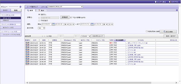 クライアントで取得したログを秘文 Serverで収集、管理する機能です。リムーバブルメディアへのコピーなどの持ち出し状況や、秘文へのログイン状況を確認することができます。
