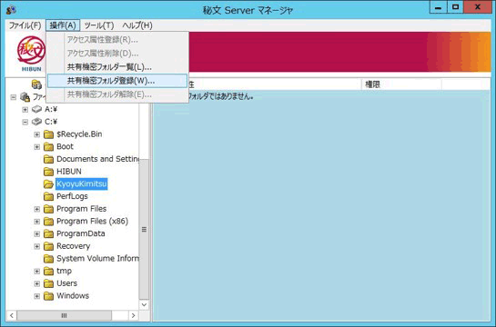 ファイルサーバー上のファイルを、共有フォルダ単位で暗号化する機能です。管理者がファイルサーバー上の暗号化したいフォルダを選択するだけです。暗号化したフォルダは秘文 Data EncryptionがインストールされたPCでのみ復号できます。 自動的に暗号化/復号処理を行うため、利用者の運用負担はありません。