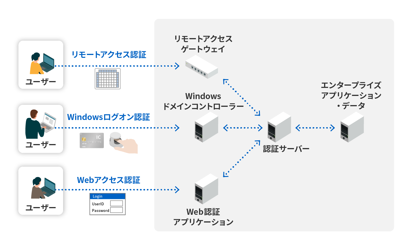 ユーザーやアプリケーション、リスクレベルや目的に応じて、さまざまな認証方式を柔軟に組み合わせた二要素認証(多要素認証)にすることで、セキュリティレベルに応じた認証強化が可能です。