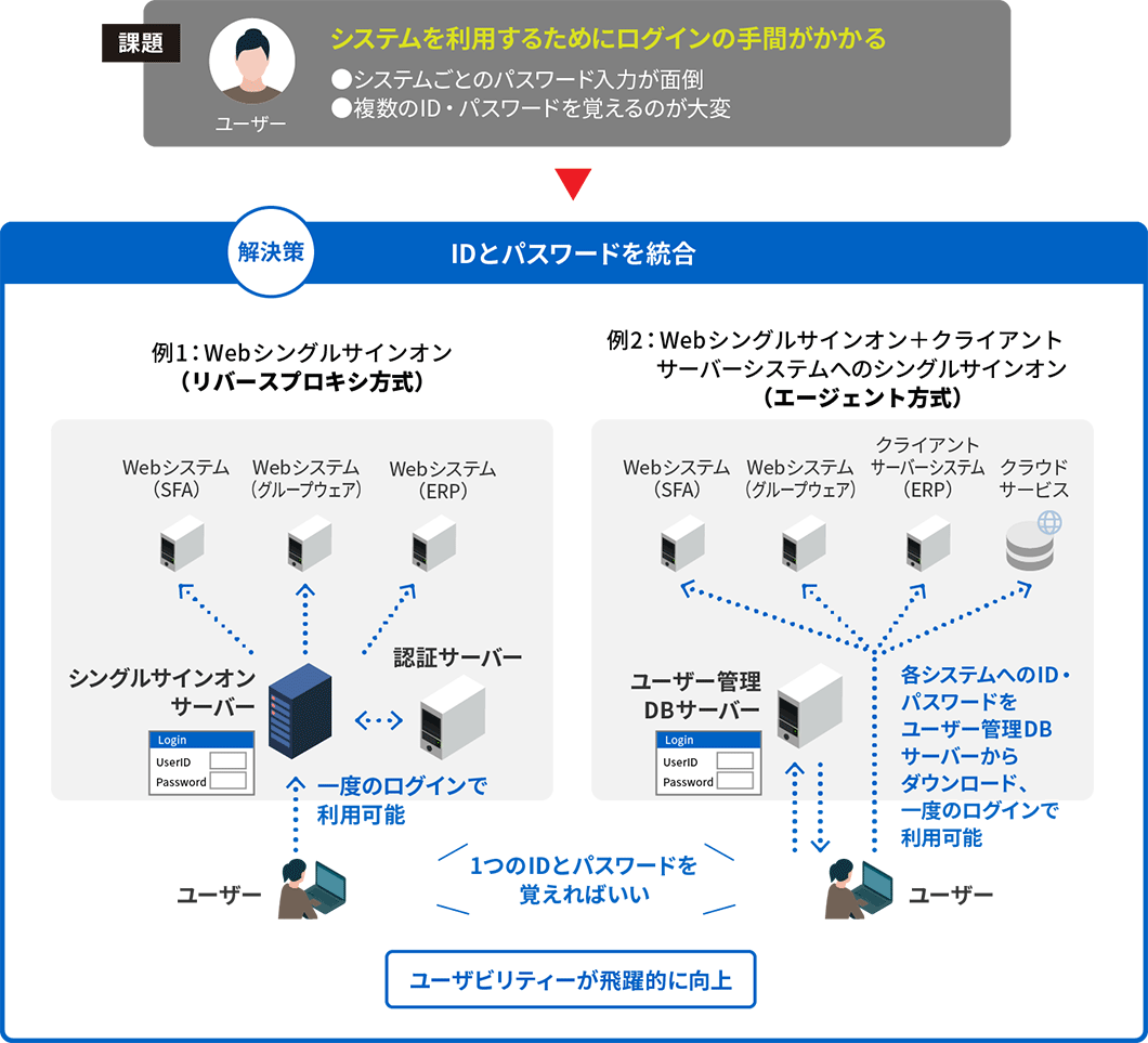 シングルサインオンソリューションではシステムごとに異なるID・パスワードを一つに統合。一度のログインで許可されたシステムすべてを利用でき、ユーザビリティも飛躍的に向上します。パスワードの管理も容易になり、再発行業務の低減にも役立ちます。