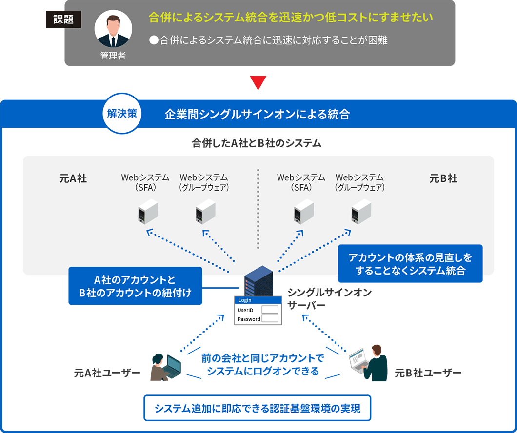 変化への迅速な対応が求められるいま、企業合併にともなうシステム統合においても時間やコストをおさえ、業務効率を落とさない仕組みが求められます。本ソリューションではシングルサインオンシステムを活用することで、システムの改修を最小限におさえたアカウント・アクセス権の統合が可能。しかもアカウント一元管理、アクセス権一元管理、シングルサインオンの3つのソリューションによってもたらされる全体最適化により、システム追加に即応できる認証基盤環境を提供します。