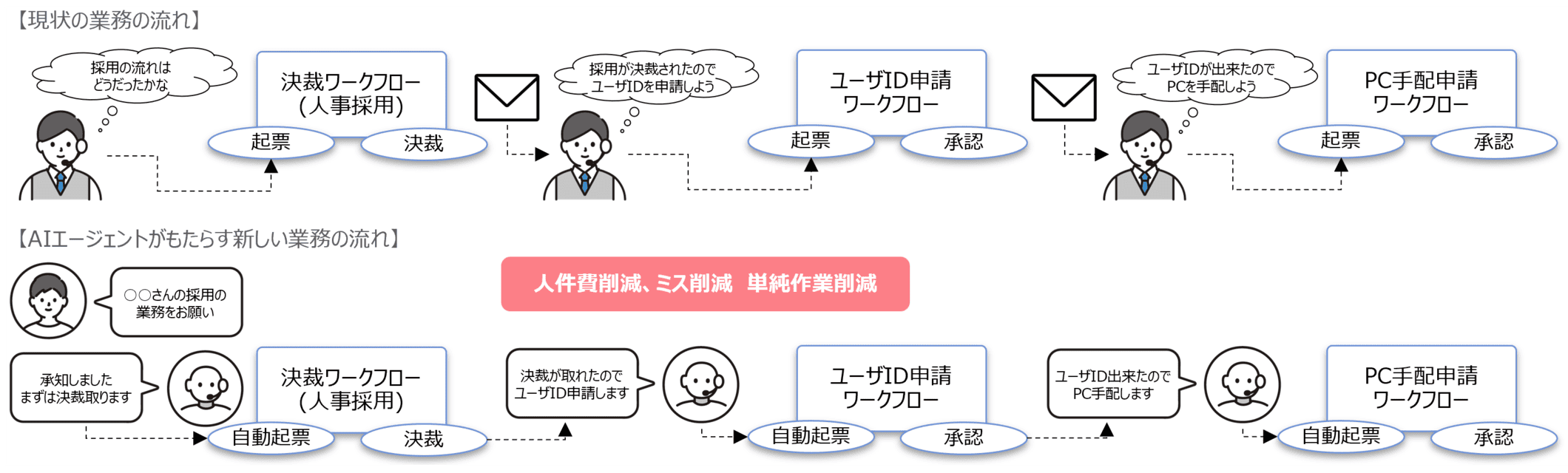 | 承認エージェント | チャットから承認待ち申請を呼出して、チャット上で承認。 | |||