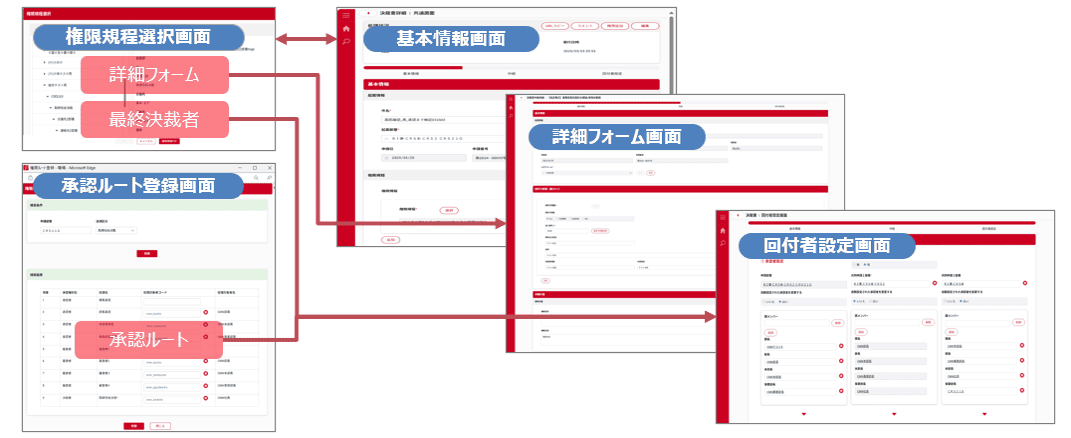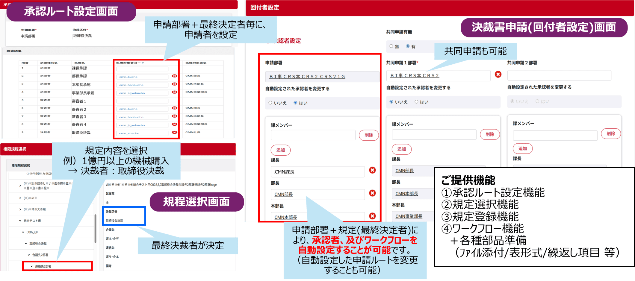 - 部署内の直列の承認や、共同申請部署、合議部署の並列の承認が可能です