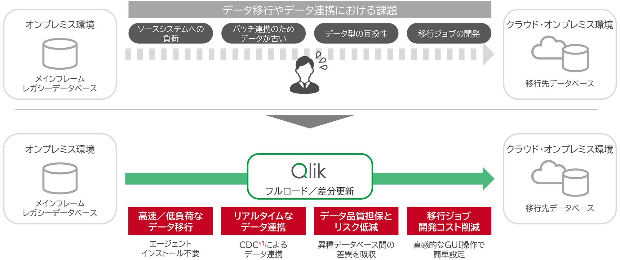 Qlikを活用することで、ソースシステムへの影響を抑えながら、データ品質を維持し、高速かつ安全なデータ移行やデータ連携が実現できます。