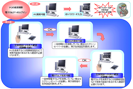 医療総合情報システム“MAPS21シリーズ”にて提供されている電子カルテシステムのログオン時のセキュリティを強化する機能として静紋をサポート。静紋にて正規のユーザーを判別し、正規のユーザーと確認された場合のみ、PCの利用と電子カルテのログオンが可能となり、不正なログオンによる電子カルテシステムの不正利用や情報漏洩を防ぐ。