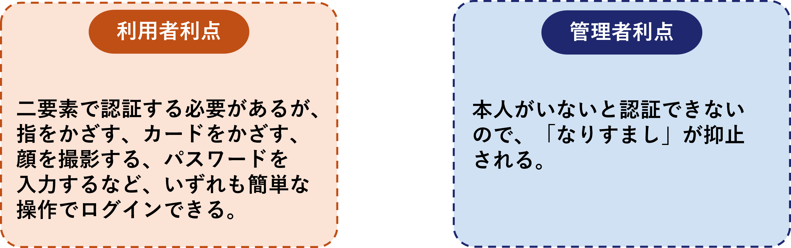 確実な本人確認のために、指静脈認証、顔認証、ICカード認証の3つの認証方式から選択することで、不正ログインを防止できます