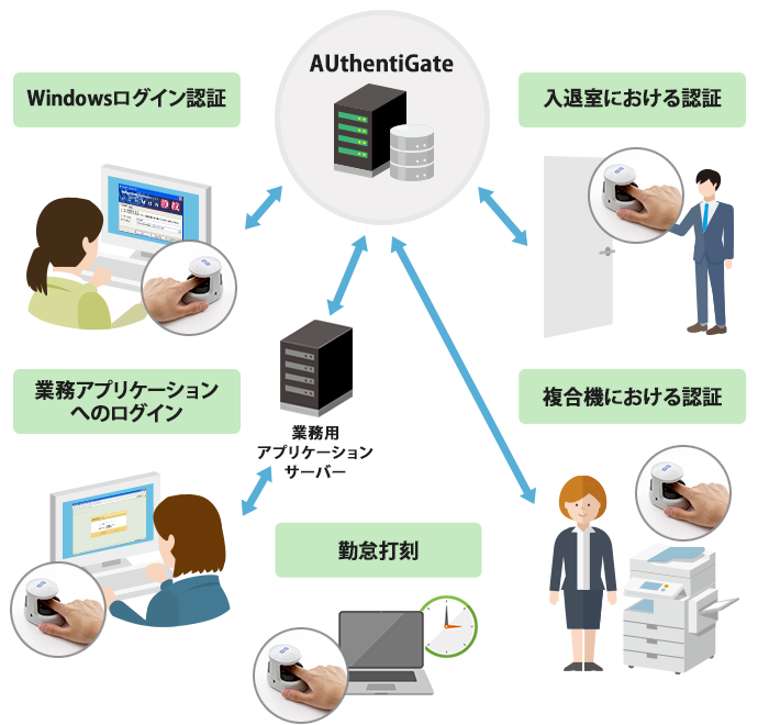 AUthentiGateは、認証情報(指静脈データ、ICカード情報、顔認証データ、ユーザー情報)を一元的に管理する認証管理システムです。