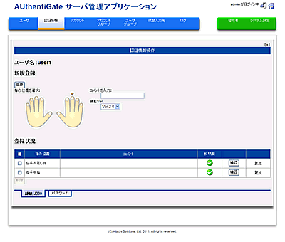 | 認証情報管理 | ユーザーの認証情報(ユーザー名、生体情報など)を集中して管理・変更・削除・確認できます。アカウントなどの利用者情報はCSV一括登録が可能です。 |
