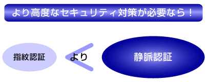 指紋認証と静脈認証との大きな違いは、身体内部の指静脈パターンを使用するため優れた認証精度であり、指紋認証に比べて偽造・改ざんが困難なためより高度なセキュリティを実現できることです。