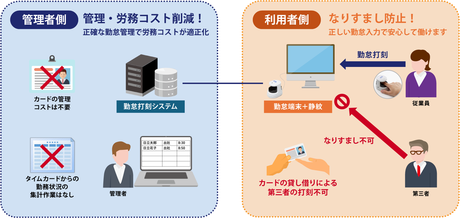 指静脈を用いた生体認証により、従業員の確実な本人確認が可能です。従業員の不正打刻やなりすましを防止し、適切な勤怠管理を実現します。厚生労働省が「労働時間の適正な把握のために使用者が講ずべき措置に関する基準」に定める「客観的な記録」にも対応します。