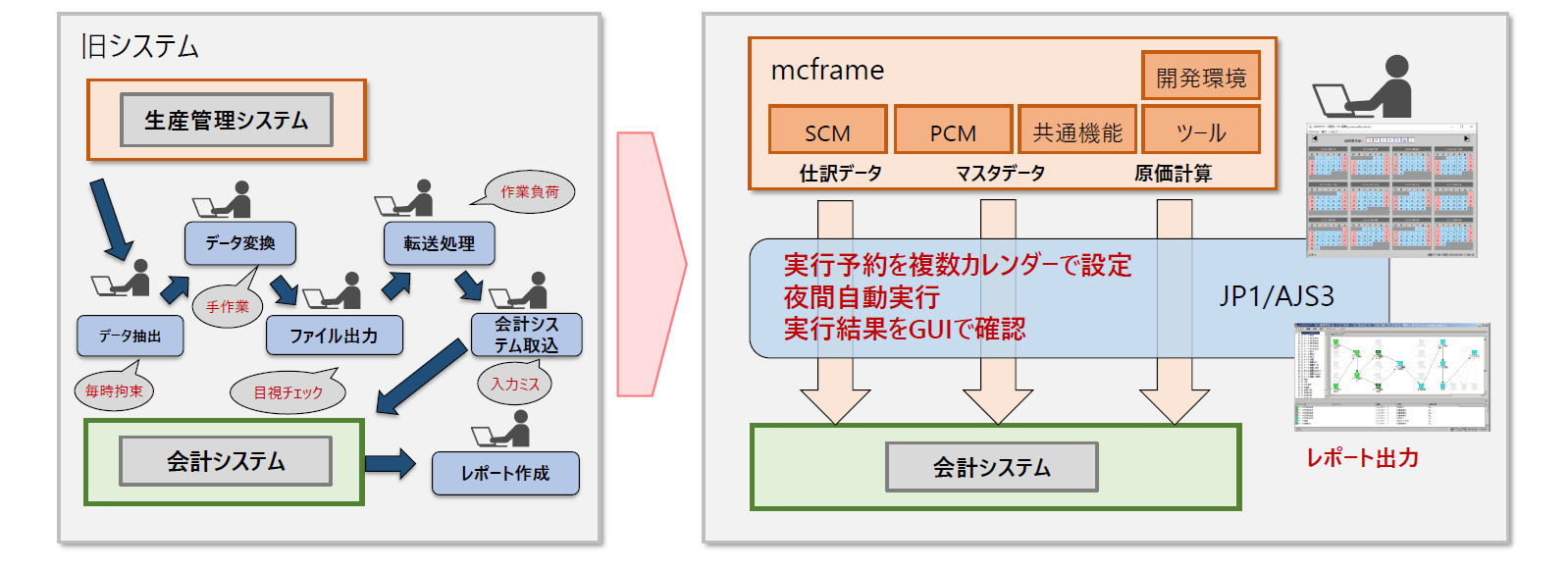 生産・販売・原価 統合パッケージ mcframeとJP1を組み合わせることにより、製造業における業務課題の解決に加え、業務運用の自動化による運用コストの削減や安定稼働を実現します。