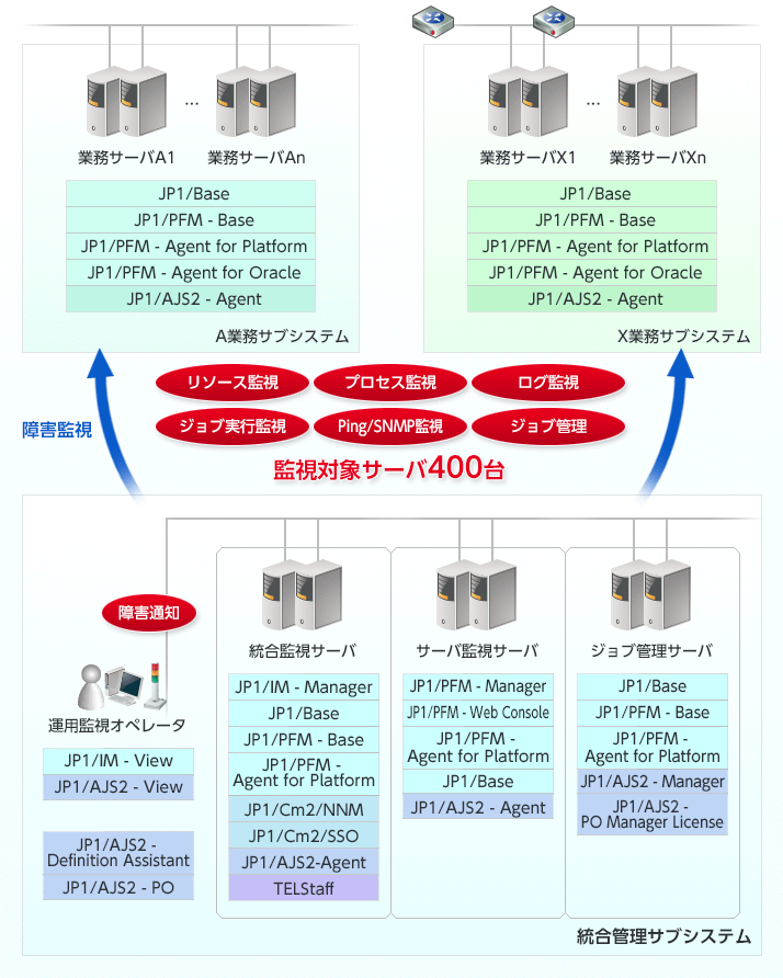 | システム規模 | JP1にて管理するサブシステム数は約10、サーバー台数は約400台、ネットワーク機器は200台程度。 |