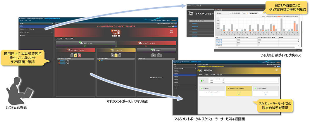 業務実行を制御するスケジューラーサービスやジョブ管理システムのデータベースなど、ジョブ管理システムの状態を1つの画面で集中監視。