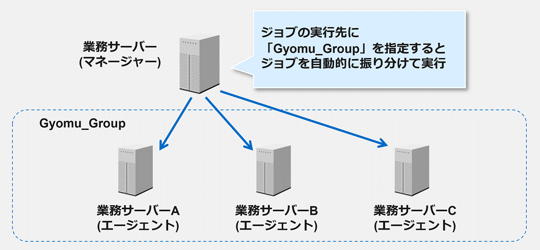 ジョブの実行先として、複数のサーバーをグループ化した名称を定義できます。グループ内のサーバーにジョブを自動的に振り分けて実行するため、業務量の増加や実行先サーバーの追加・変更にも柔軟に対応できます。