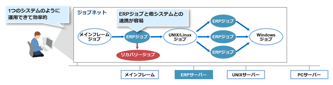 ジョブの1つとしてSAP ERPジョブを定義でき、ほかのジョブと同様に実行、監視ができます。ほかシステムとの連携が容易になり、1つのシステムのように運用できます。SAP ERPジョブを定義する際は、SAP ERPで定義済みのジョブをコピーして利用できるため、効率よくSAP ERPシステムとの連携を実現できます。