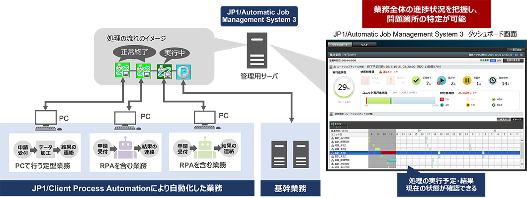 - どこで問題が発生しているかを容易に特定でき、対象業務の再実行・保留などの対処をスムーズに行えます。