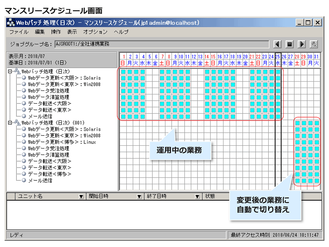 業務の変更時には、運用中の業務を停止することなく計画的にジョブネットの切り替えができます。事前に追加・変更したジョブネットを登録しておけば、決められた日時に自動で変更後の業務に切り替わります。